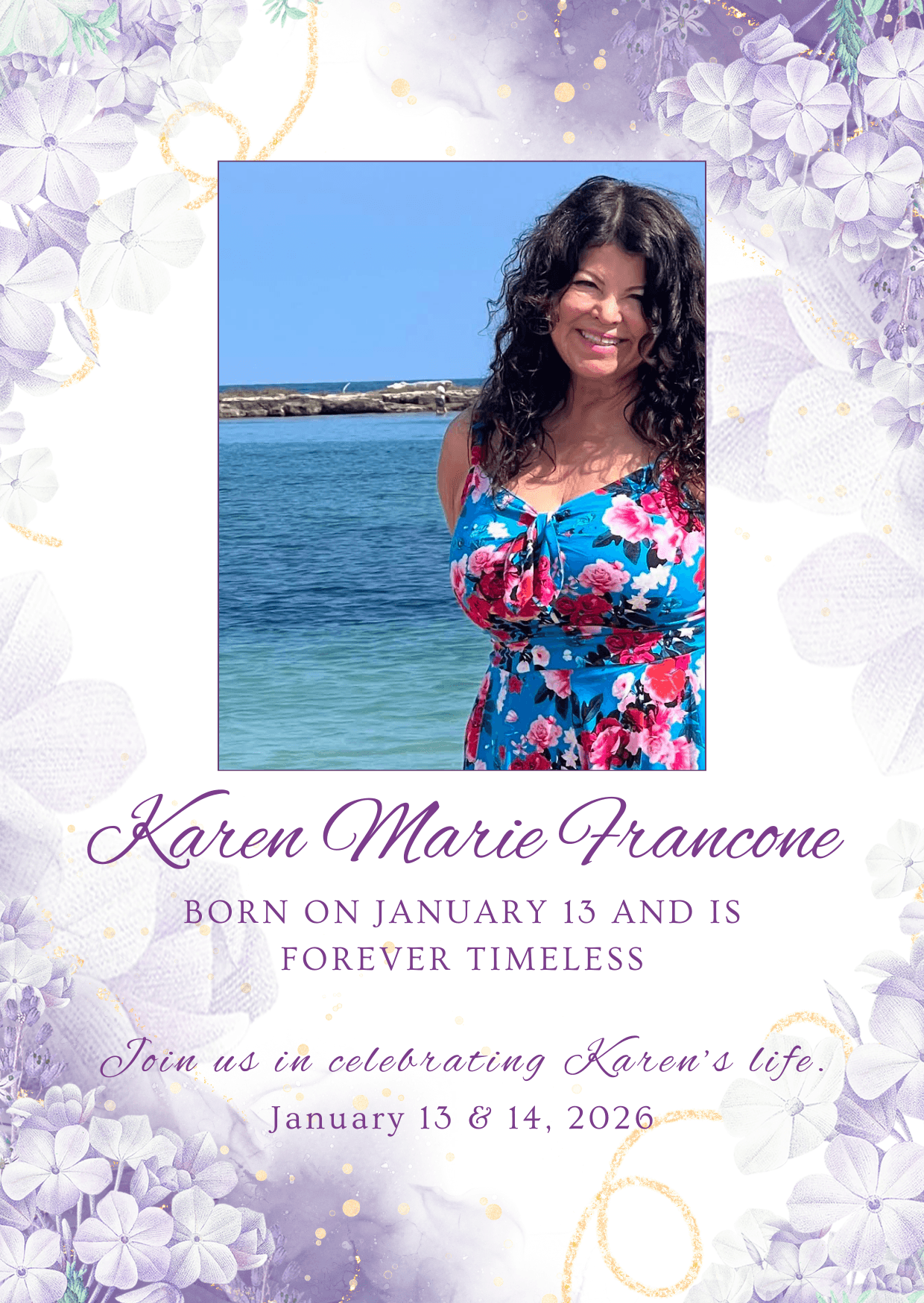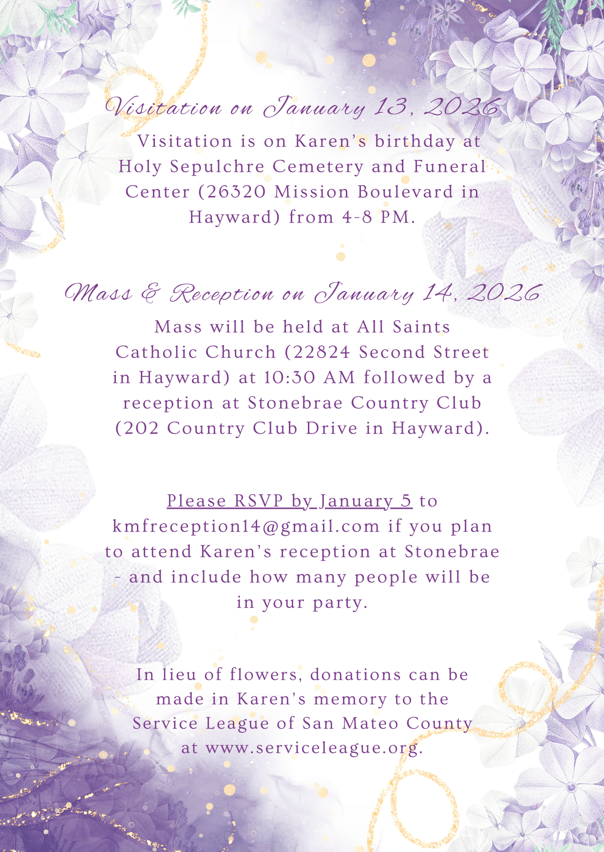 Visitation on January 13, 2026: Visitation is on Karen’s birthday at Holy Sepulchre Cemetery and Funeral Center (26320 Mission Boulevard in Hayward) from 4-8 PM.